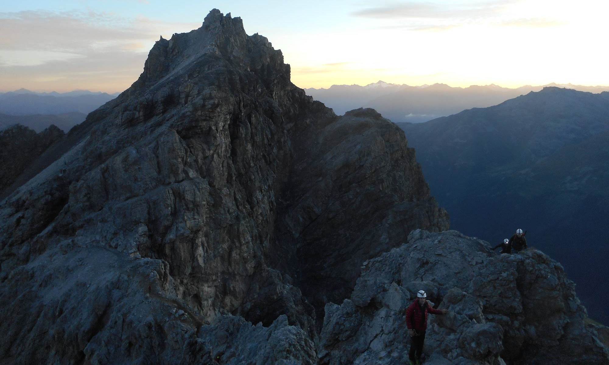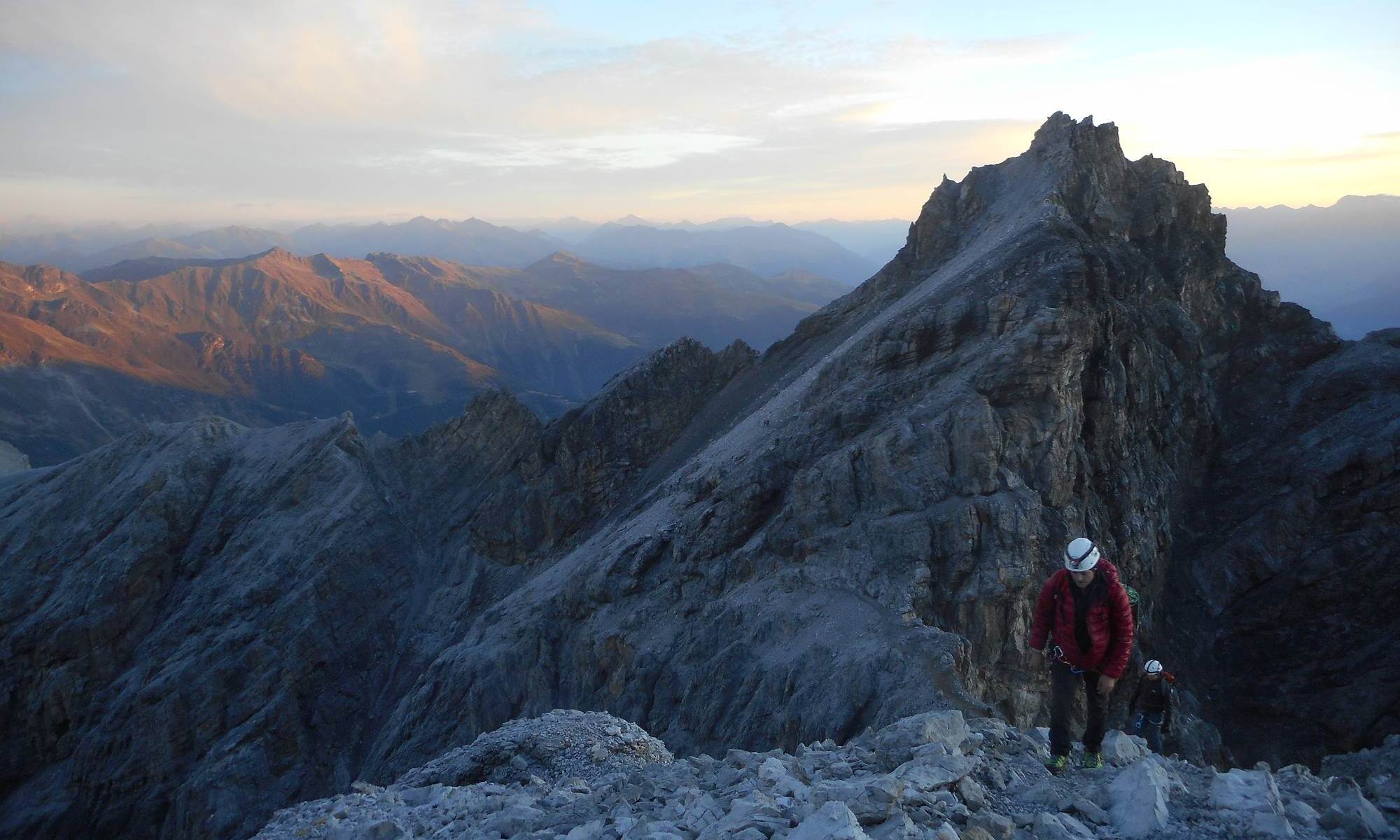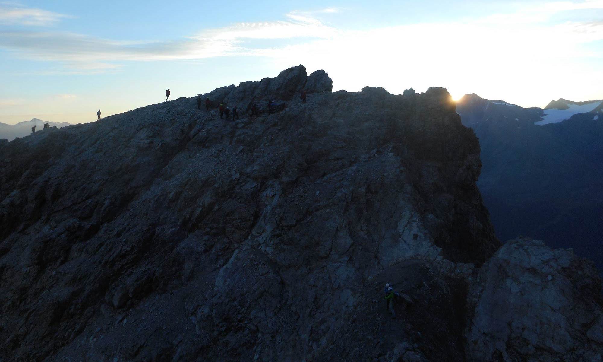 Am nächsten morgen früher Start Richtung Gipfel, direkt nach der Hütte beginnen die teilweise ausgesetzen Felspassagen mit Kletterschwierigkeit bis zum III. Grad (je nach Verhältnissen). Hierbei muss die Tabarettaspitze umstiegen werden und eine ca. 70m hohe mit Stahlketten versicherte Kletterstelle muss am Tschierfleckwandl überwunden werden. Nach dem Tschierfleckwandl wird die Schlüsselstelle der Kletterpassage überwunden. Danach wird an einer günstigen Stelle die Steigeisen angelegt und nun geht es bis zum Gipfel immer auf dem Gletscher aufwärts, dabei müssen einige Spalten passiert werden. Schlussendlich wird der Gipfelgrat erreicht und von dort ein Stück über den Grat bis der Gipfel des Ortler mit 3905m erreicht wird.