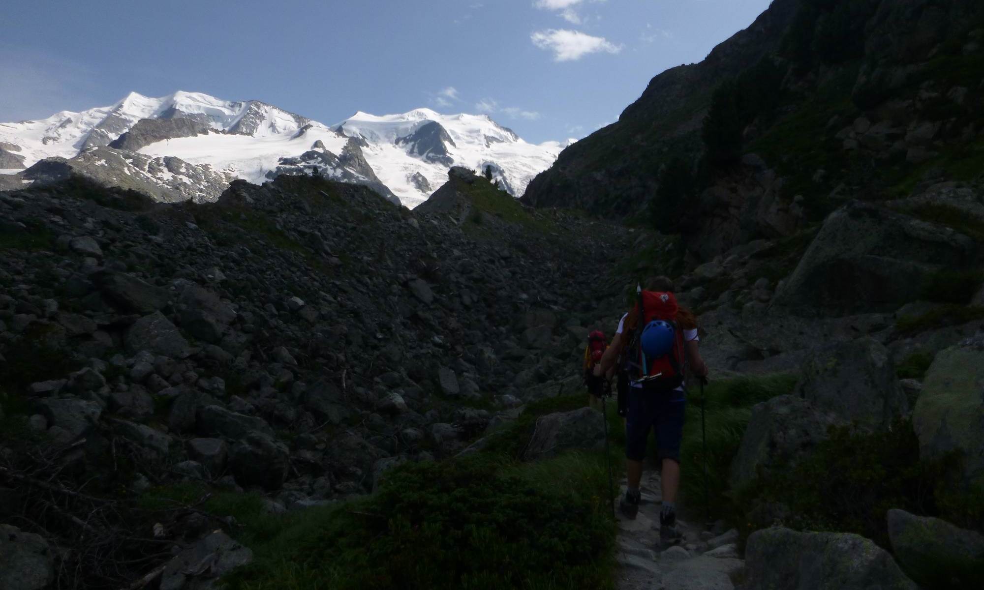 Die Tour startet beim Bahnhof Morteratsch 1896m im Talort Pontresina. Der Aufstieg zur Hütte erfolgt unschwierig den Wegweisern folgend entlang der Gletschermoräne aufwärts. Die Bovalhütte wird schlussendlich auf 2495m erreicht - Wegstrecke 5,3km.