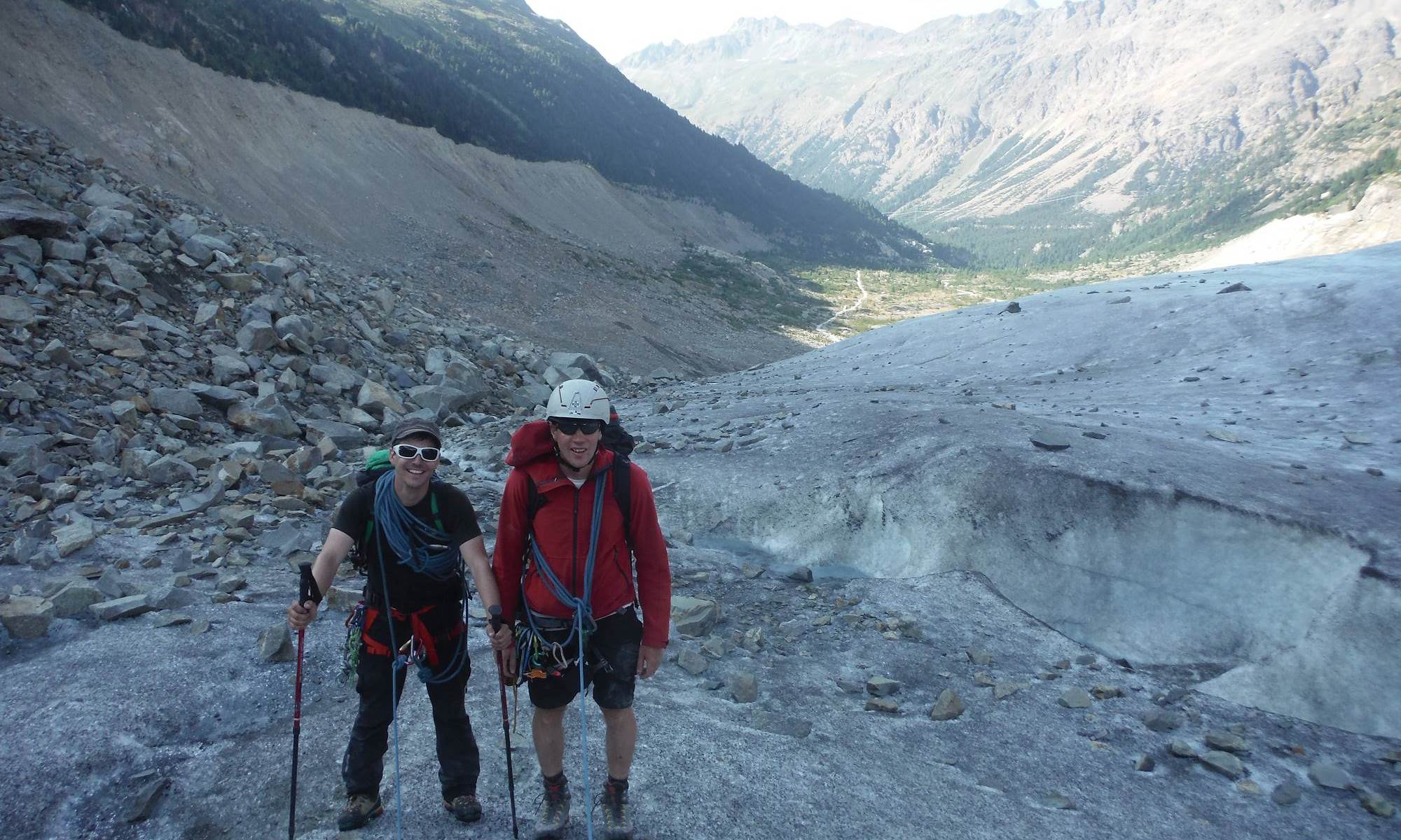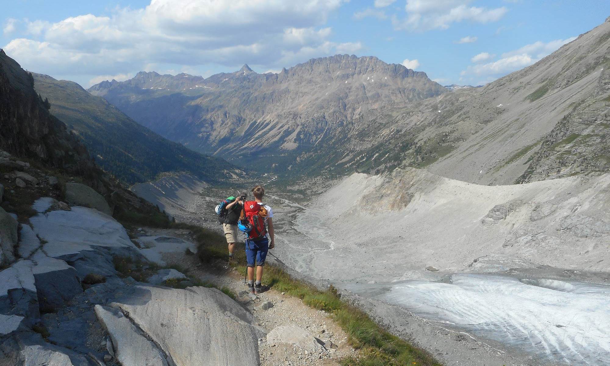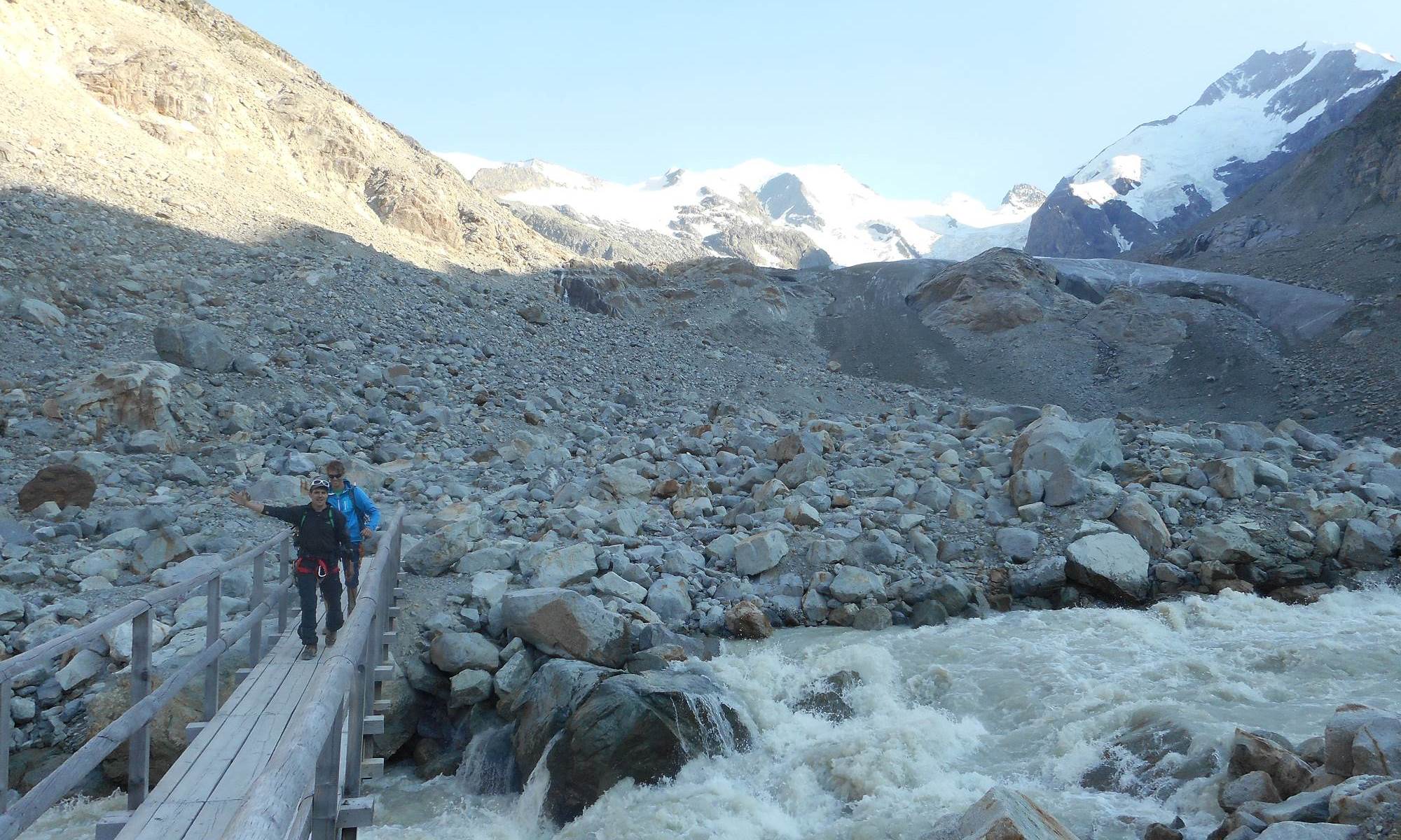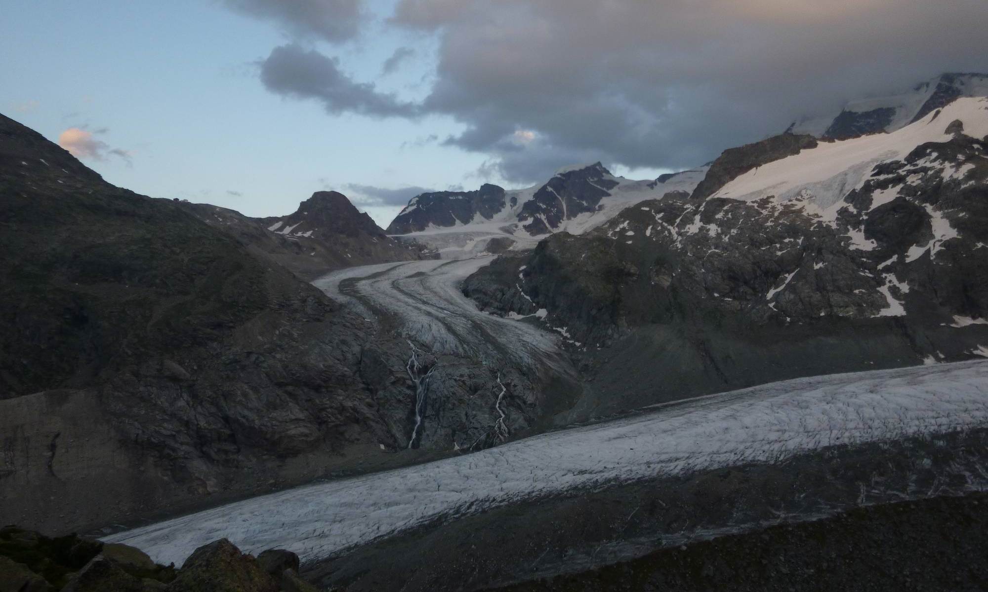 ...oder der weitere Abstieg erfolgt über einen Steig abwärts zur Gletschermoräne Pers, dort den Gletscher betreten. Dieser wird in südwestlicher Richtung gequert und auf den Felsen Isla Persa 2720m aufgestiegen. Dort über ein Steig abwärts zum Morteratsch-Gletscher, diesen auf der linken Seite abwärts folgen. Schlussendlich wird der Gletscherbruch auf ca. 2130m erreicht, von dort unschwierig über einen Schotterweg auswärts zum Ausgangspunkt wandern - Wegstrecke 8,2km.
