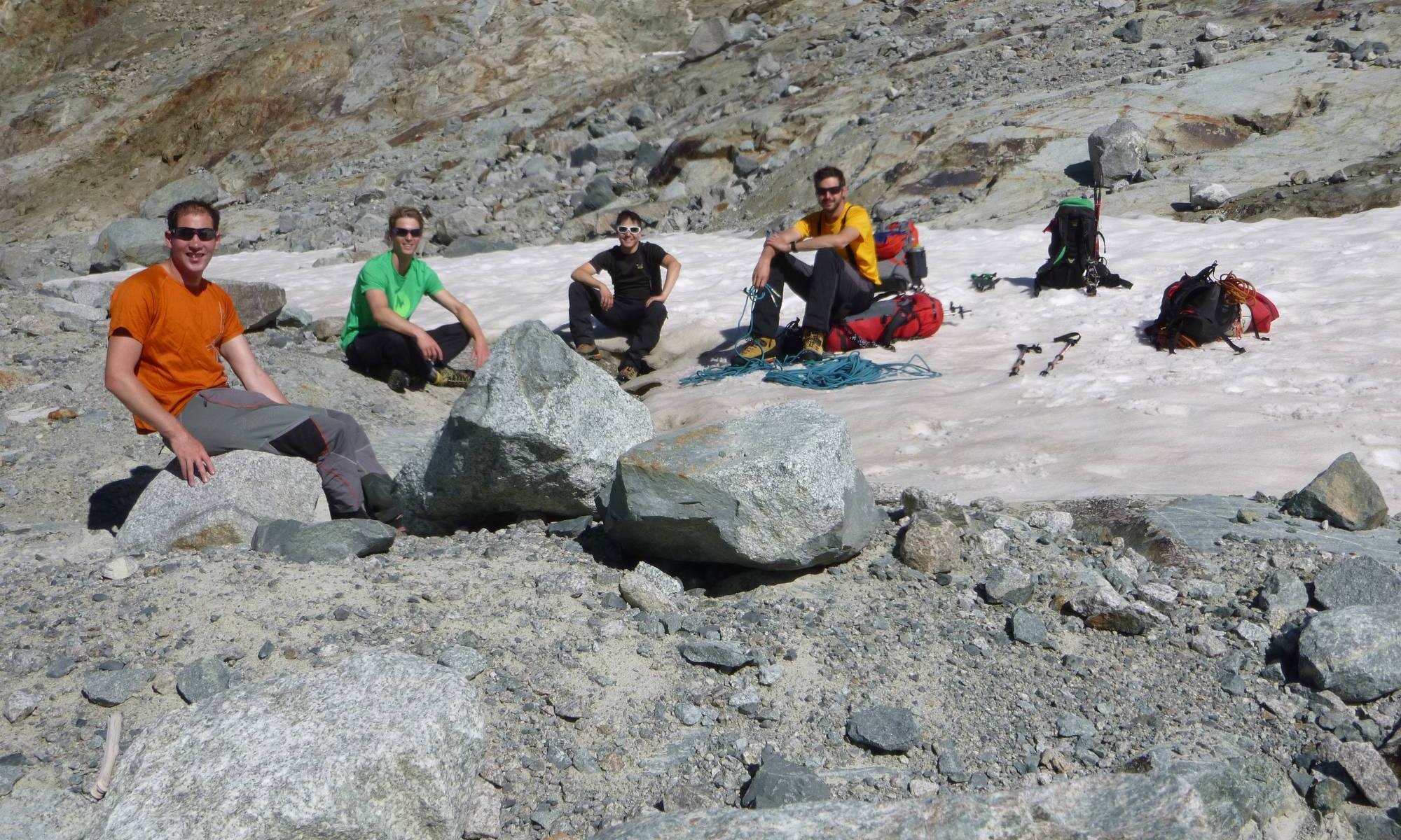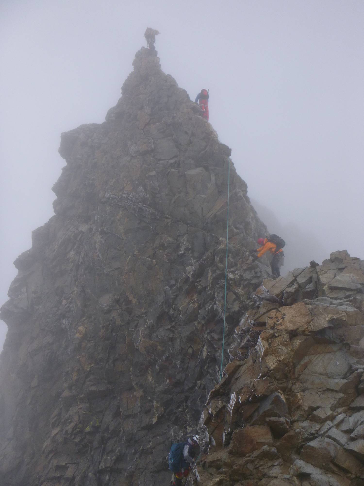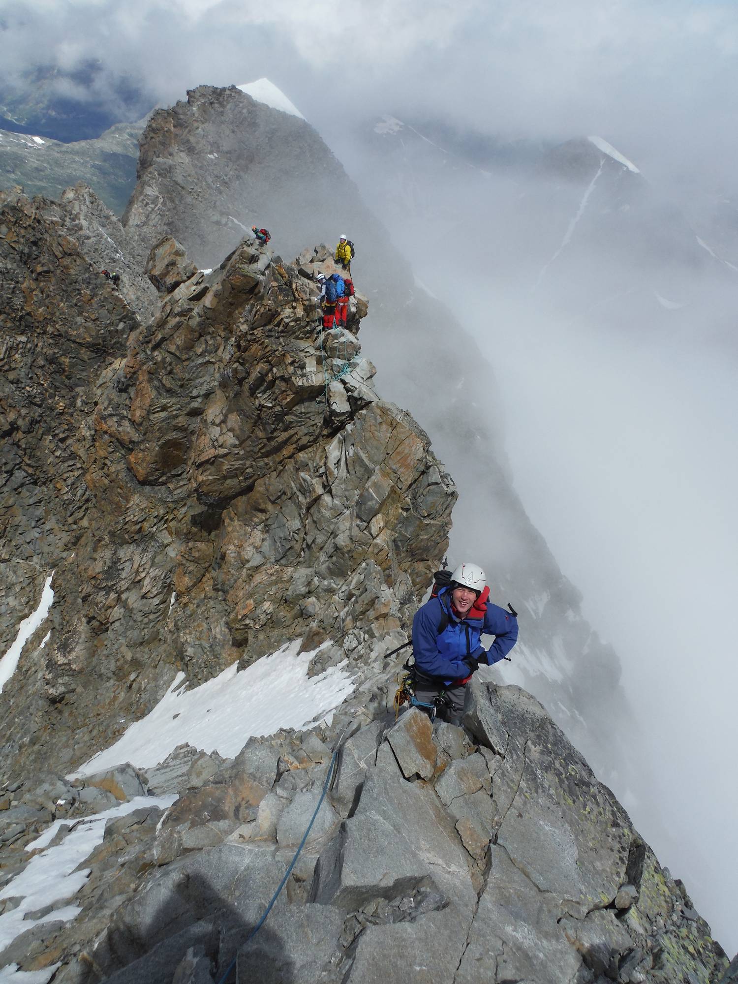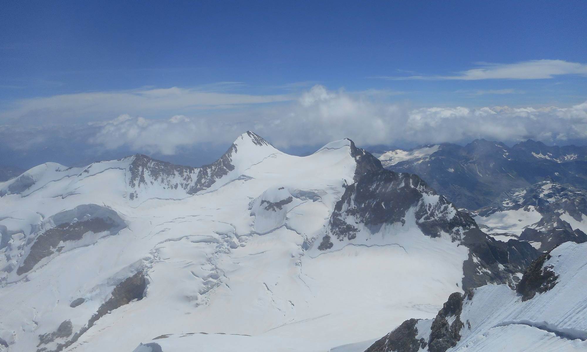 Der Abstieg erfolgte über den Spallagrat mit mehreren Abseilstellen hinunter zur Marco e Rosa Hütte auf 3597m - Wegstrecke 7,5km, jedoch 620Hm Gratanstieg!