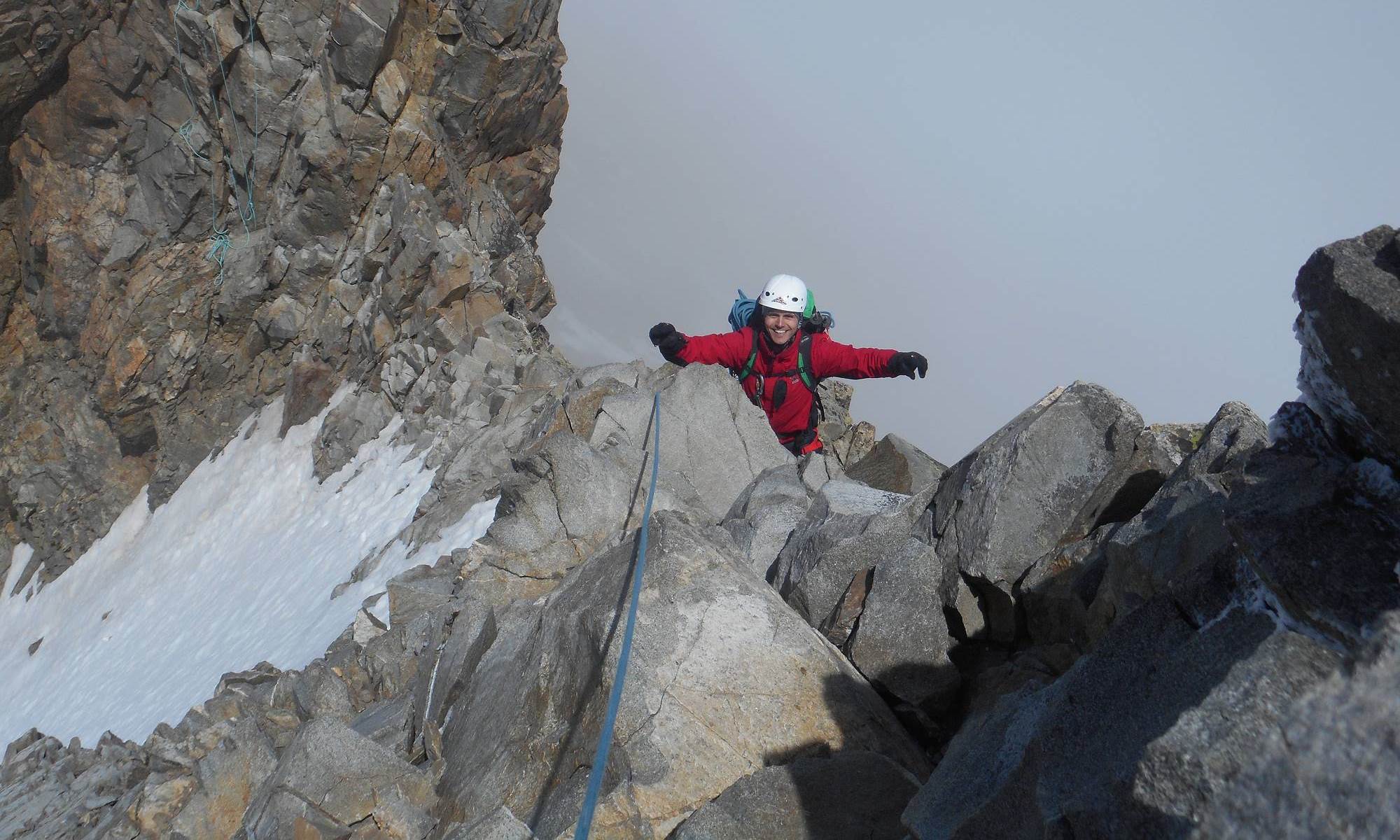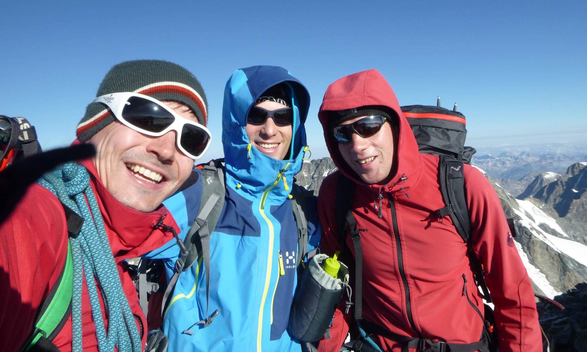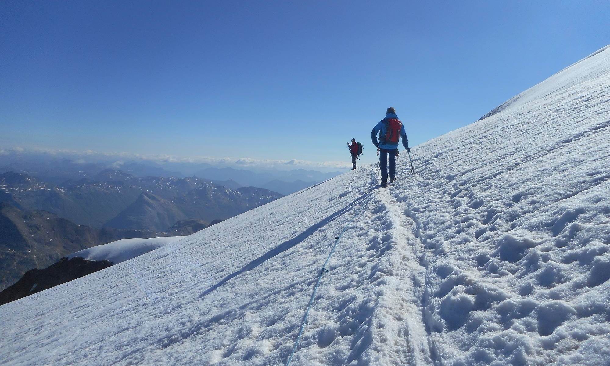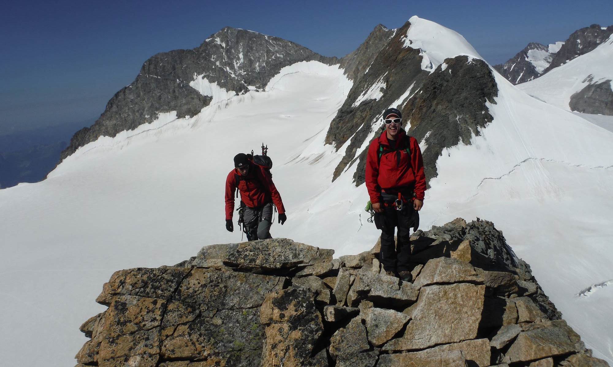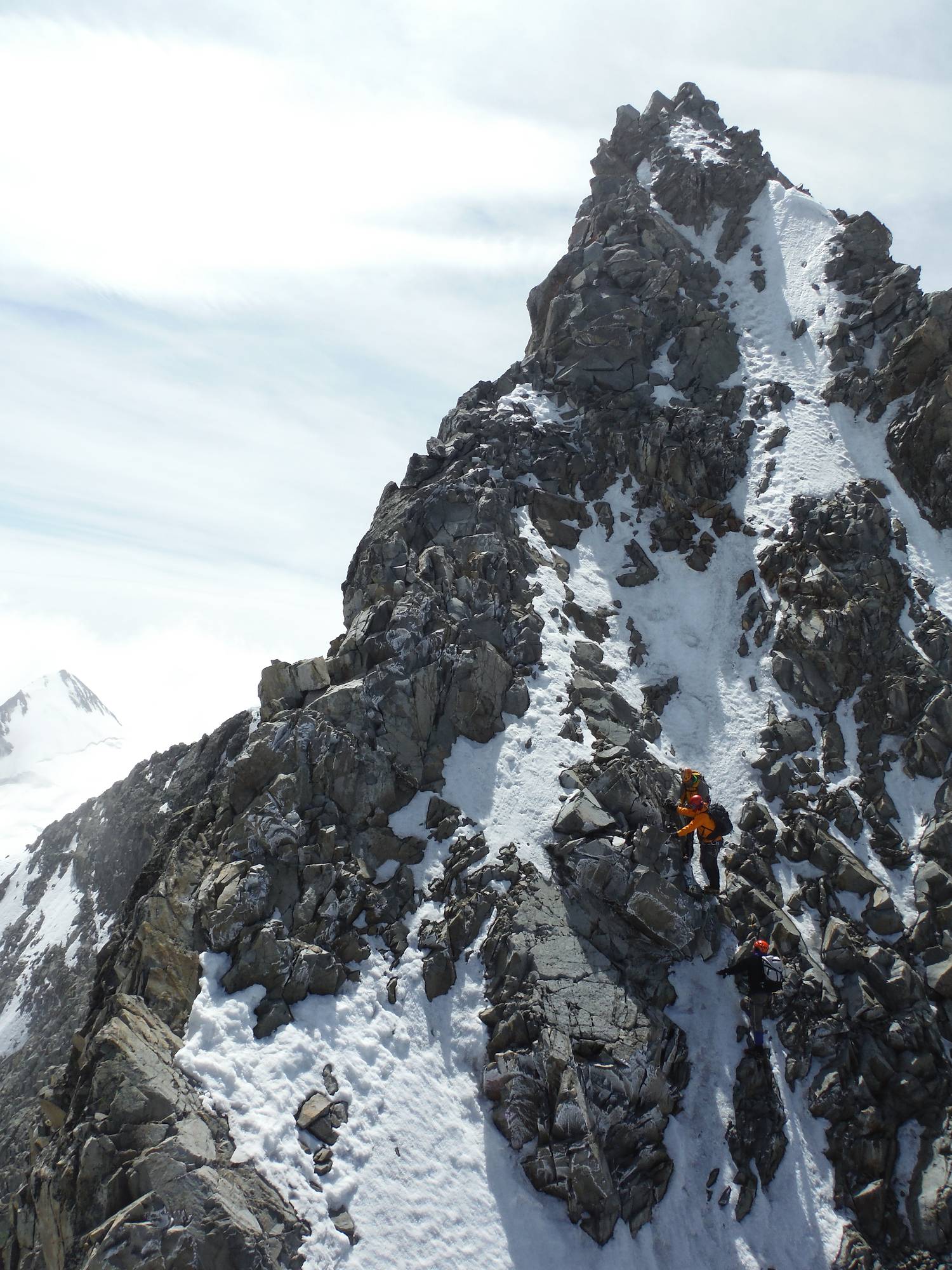 Nun über die Bellavista-Terrasse bis zum Einstieg des Palü-Westgipfels (Piz Spinas) gehen. Der Westgipfel 3823m hat eine Felsgrat im zweiten Schwierigkeitsgrad, der weitere Anstieg zum Hauptgipfel 3901m ist unschwierig. Ab dort ist der Abstieg über den Firngrat ausgesetzt, aber der Aufstieg zum Ostgipfel 3883m wieder unschwierig.