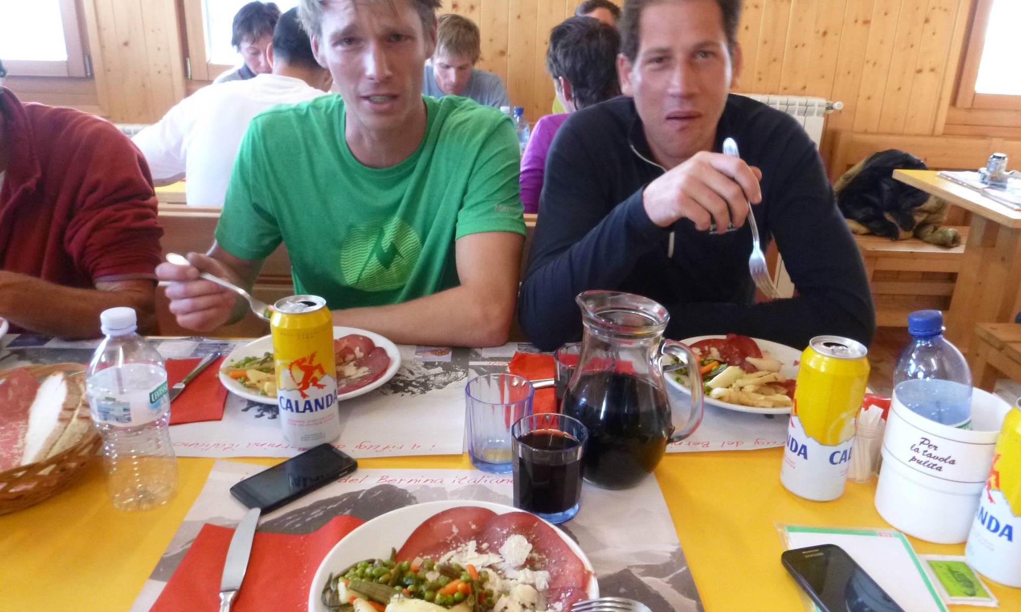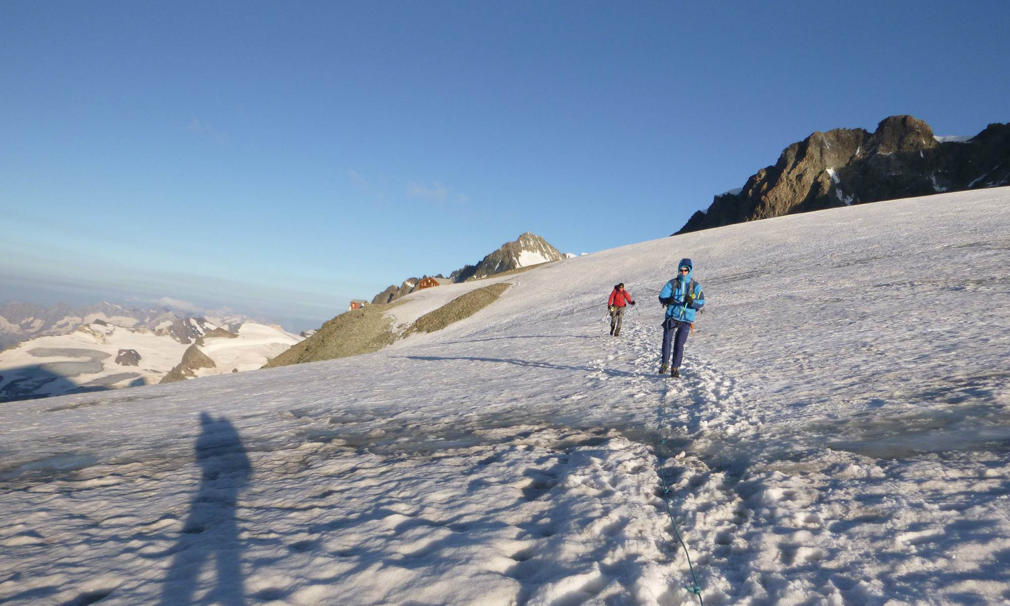 Der Abstieg vom Ostgipfel erfolgt wieder über einen schmalen ausgesetzten Firngrat. Anschließend über eine 40° steile Flanke absteigen. Der weitere Abstieg erfolgt zwar unschwierig, aber es müssen einige Spalten umgangen werden. Die Bergstation Diavolezza wird über einen leichten Gegenanstieg am Gletscher sowie ein schmalen Steig im Fels im auf und ab auf 2973m erreicht - Wegstrecke 12,9km.