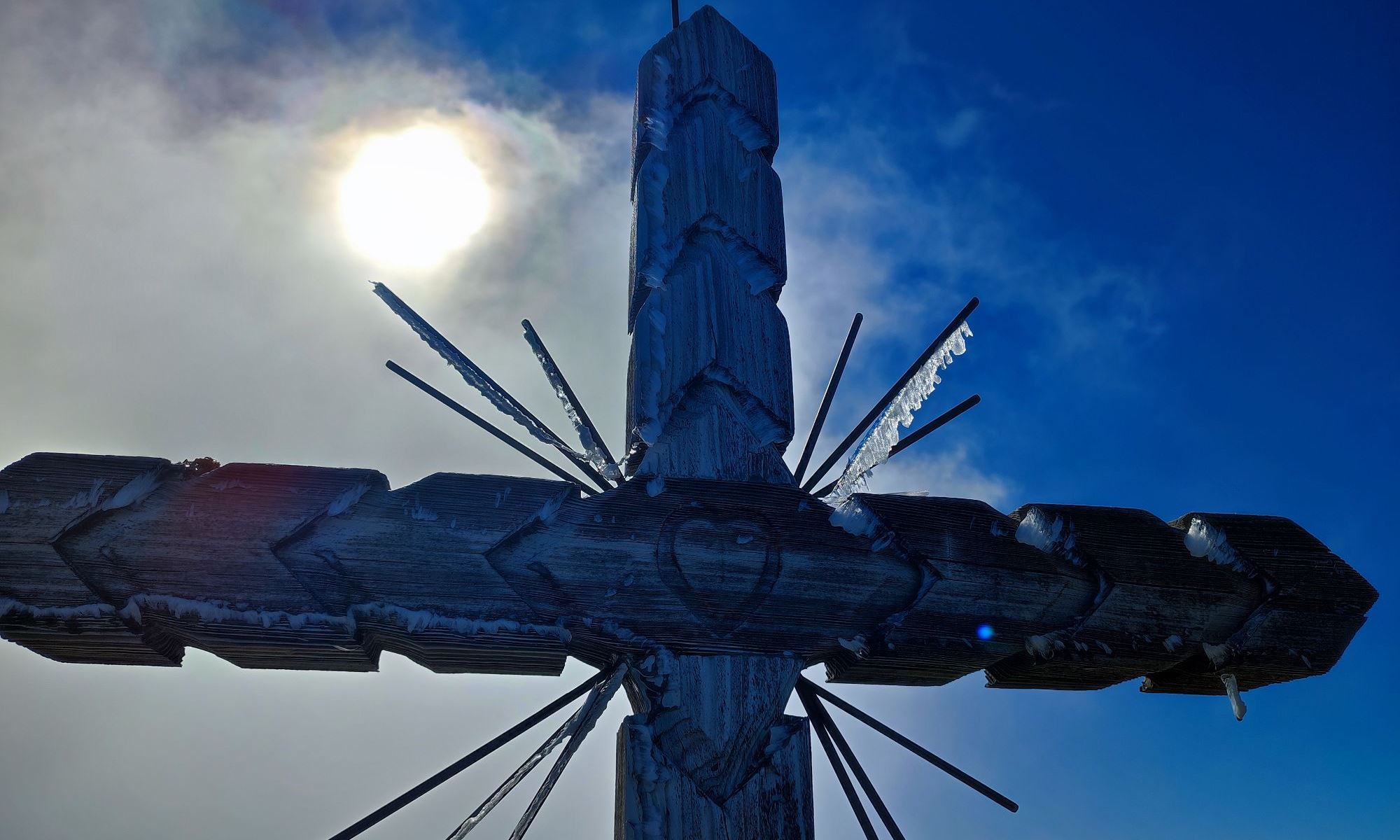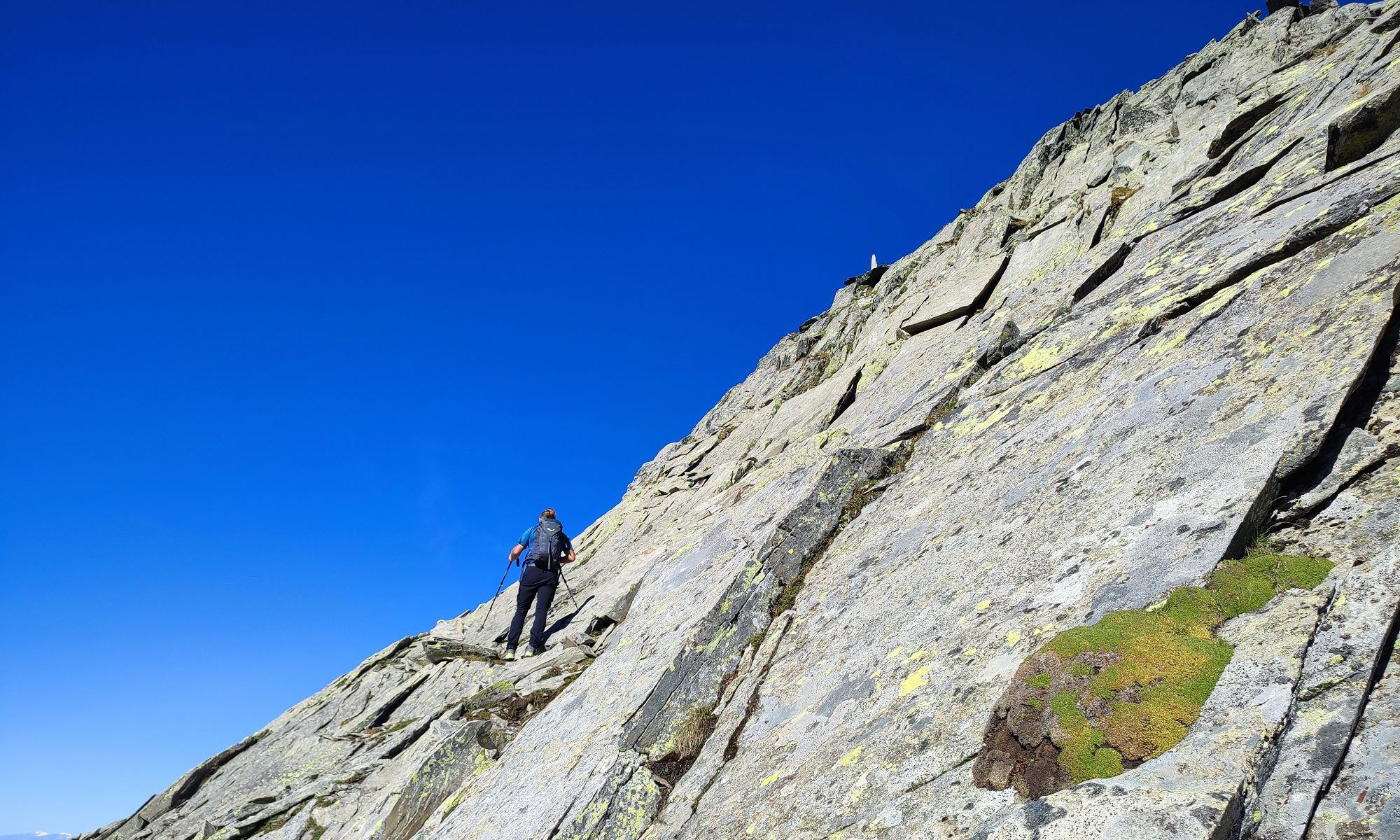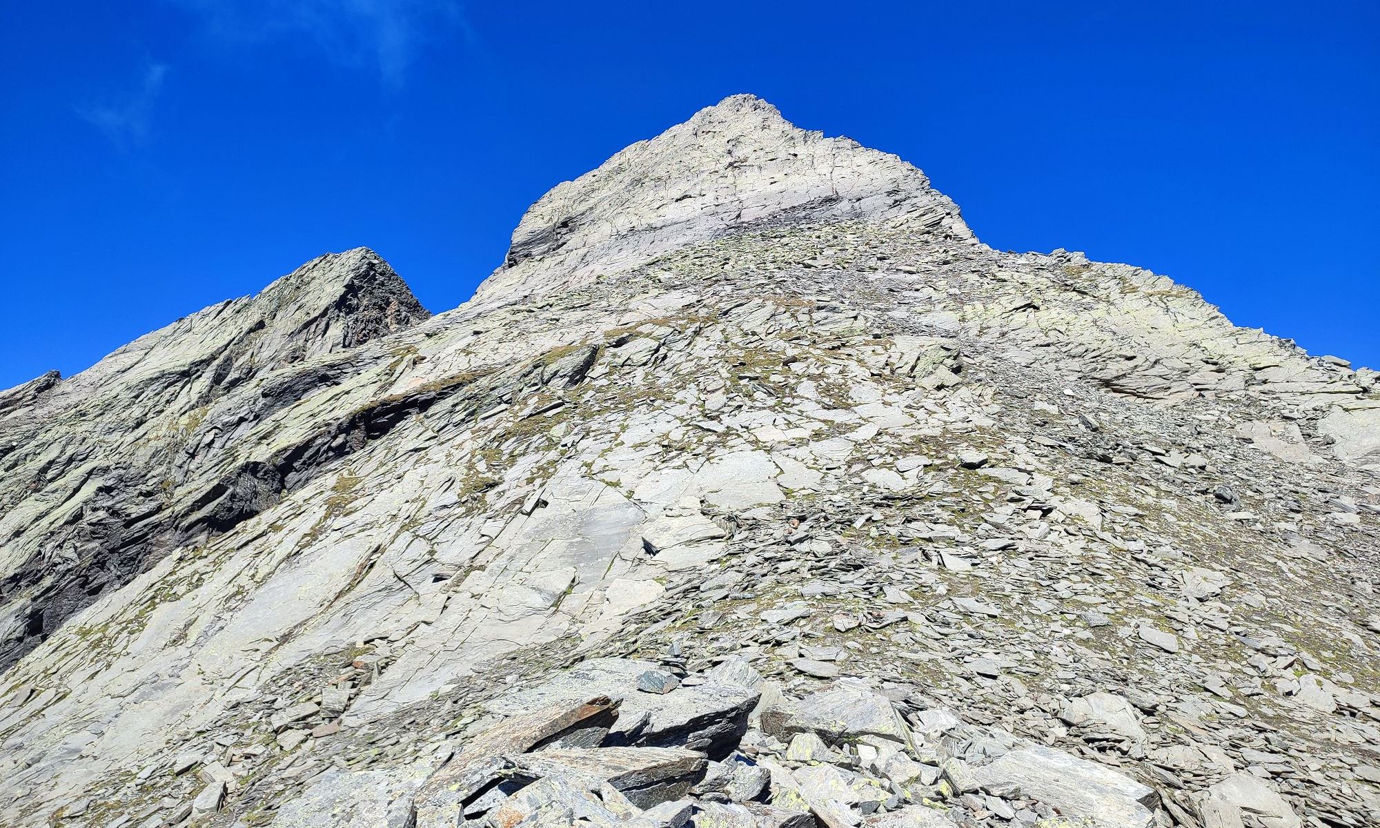 Auf einer Höhe von 2720m folgt man der markanten Rinne rechts haltend (grün). Die Schlüsselstelle ist ein durchegehendes ca. 3m hohes Felsband, über glatte Platten hier aufsteigen, Schwierigkeit II+, aber nicht ausgesetzt (die Stelle kann je Verhältnissen nass und eisig sein). Weiter geht es nun unschwierig auf den Südostgrat, anschließend in Serpentinen aufwärts unterhalb des plattigen Gipfelaufbaus. Über Felsbänder kann hier gut aufgestiegen werden, je nach Routenwahl bis zur Schwierigkeit II-.