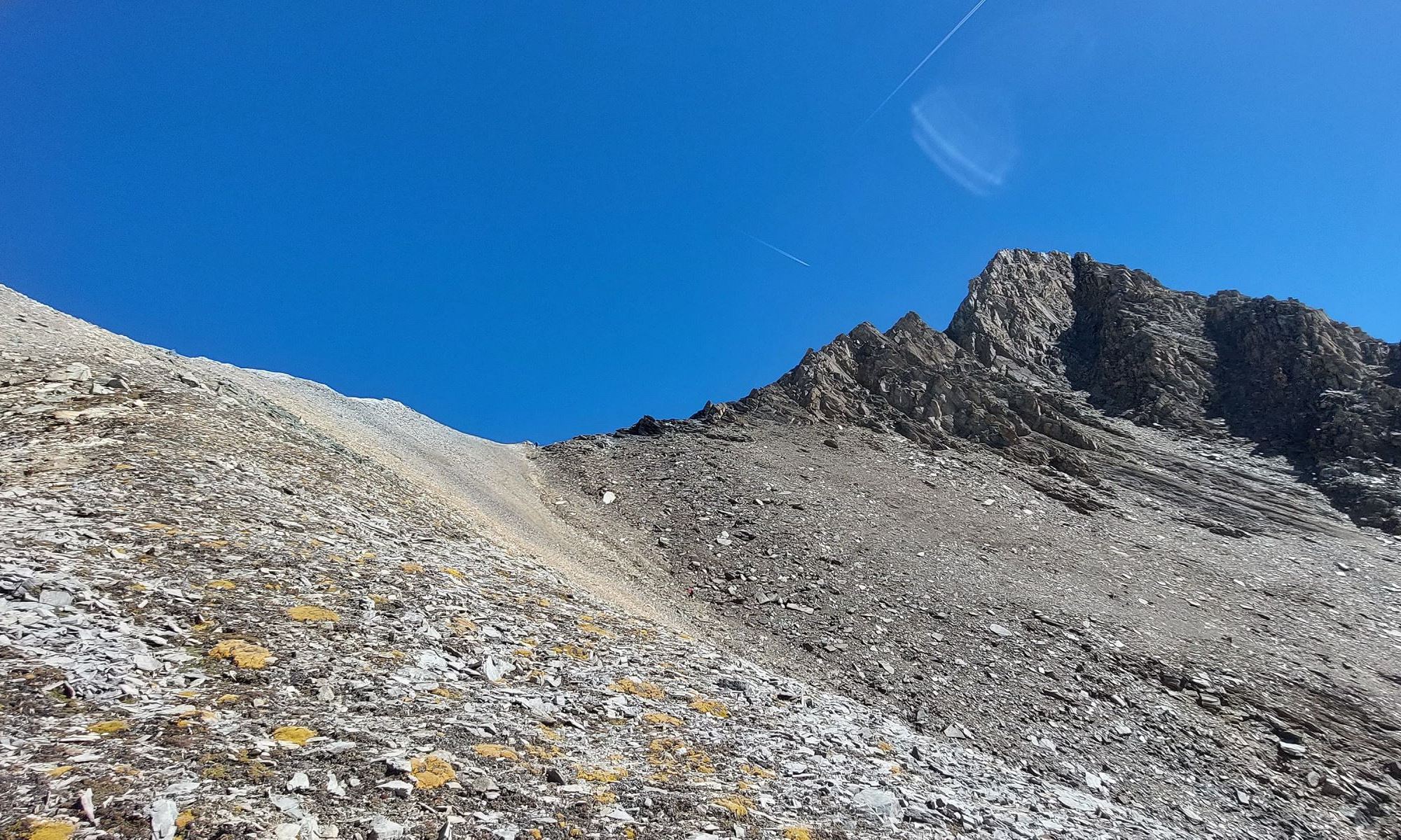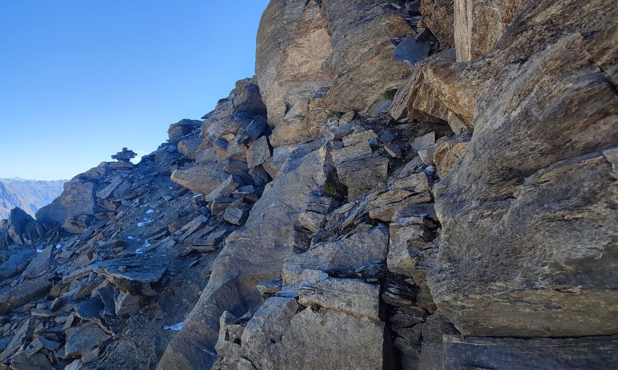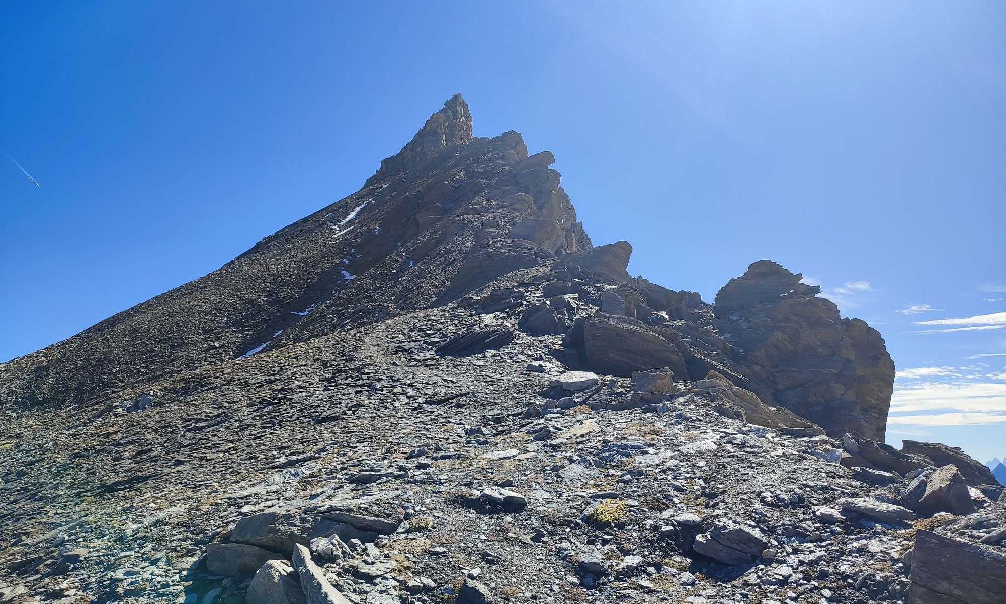 Weiter geht es hier in südöstlicher Richtung links vom Grat über die Flanke steiler werdend aufwärts. Unterhalb des Gipfels in der Nordostflanke wird ein steiles Blockgelände erreicht, den Steinmännern nach oben in leichter Kletterei folgen. Ganz zum Schluss wird das Gelände ganz kurz ausgesetzt und hier muss die Schlüsselstelle mit II überwunden werden. Der Gipfel Quirl wird auf 3251m erreicht, der zweite Ostgipfel besitzt ein neues Gipfelkreuz (haben wir nicht mehr bestiegen).