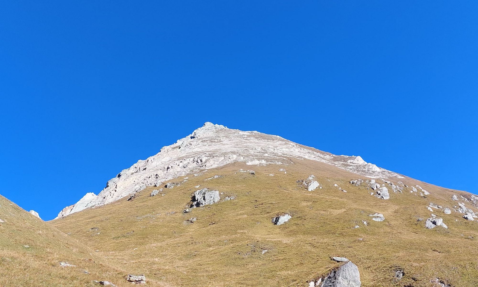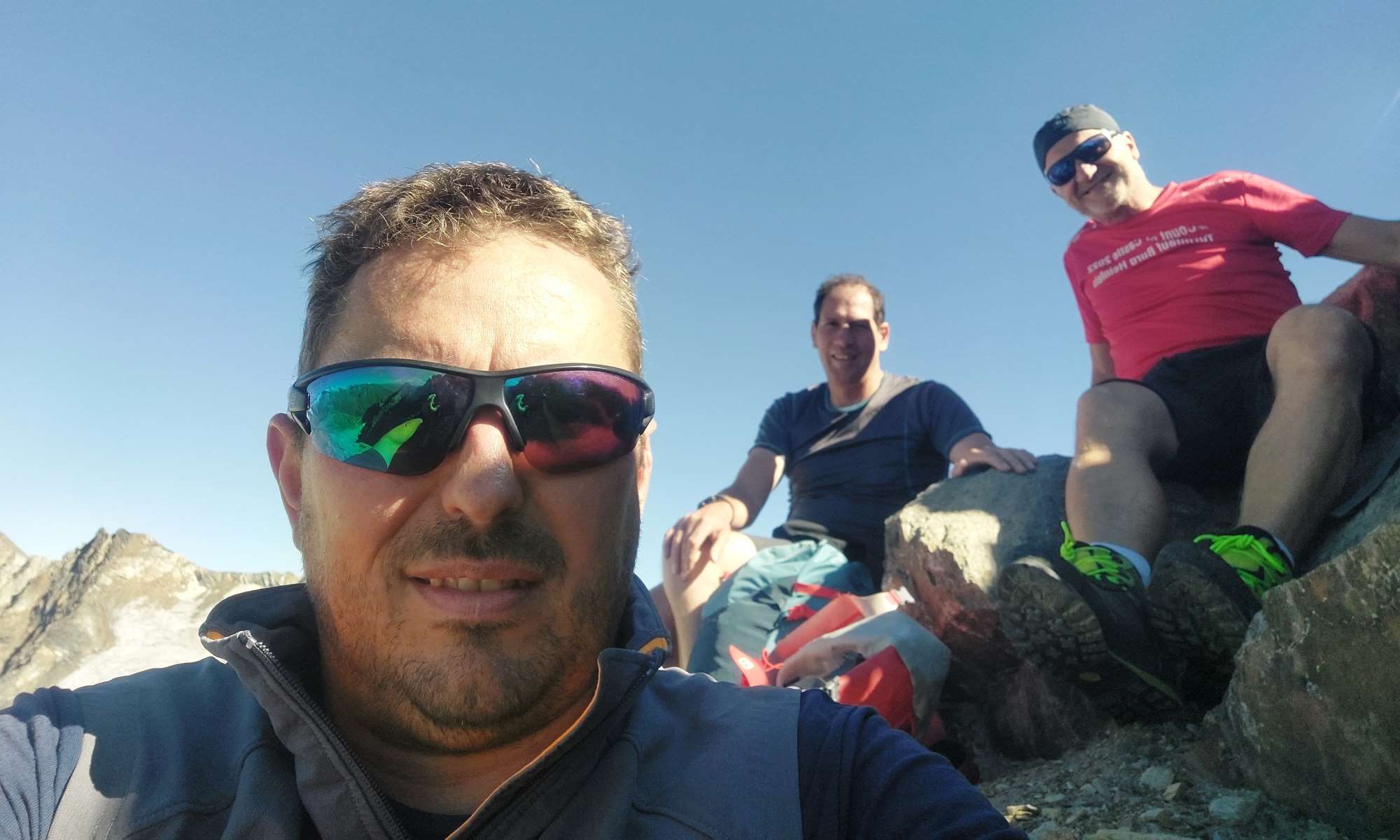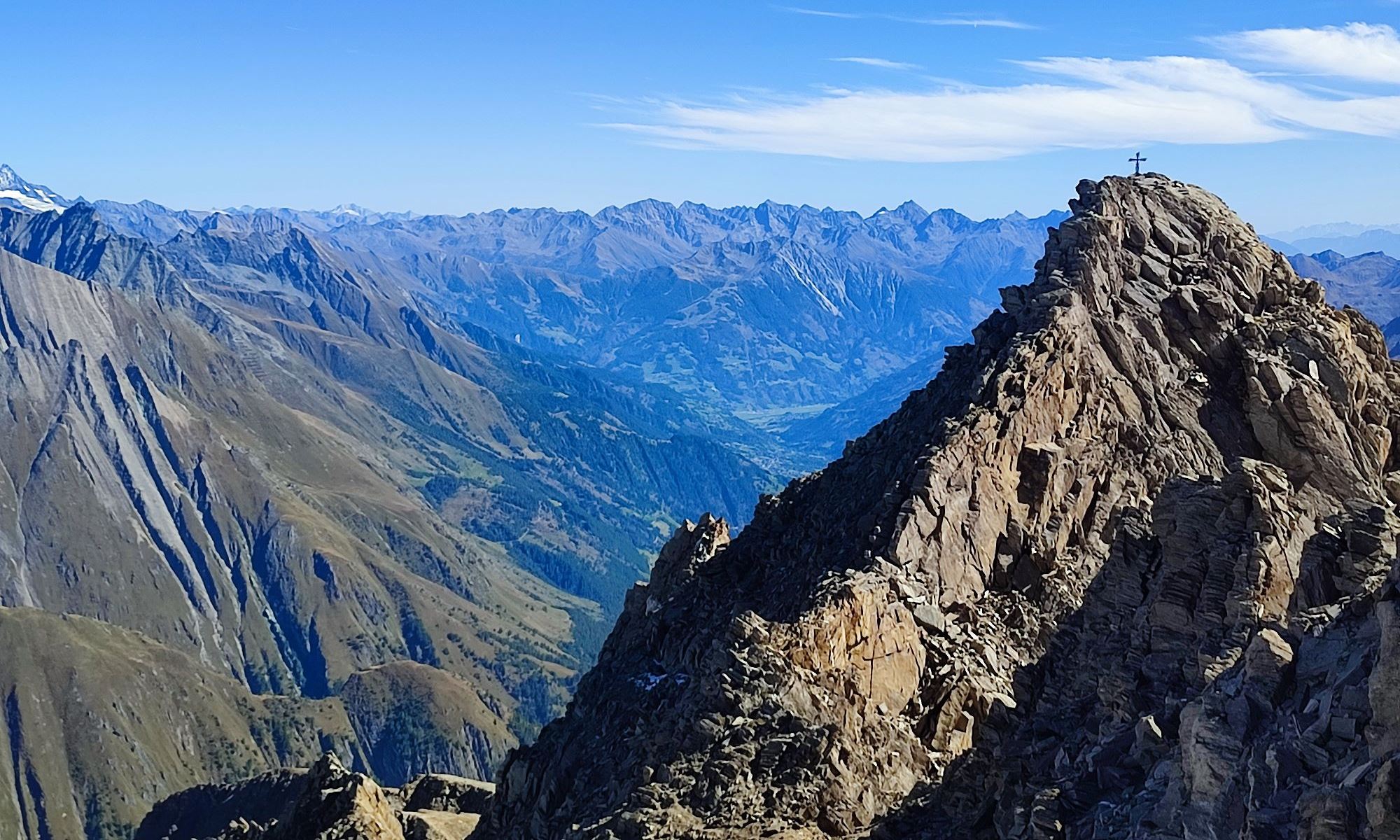 Weiter geht es hier in südöstlicher Richtung links vom Grat über die Flanke steiler werdend aufwärts. Unterhalb des Gipfels in der Nordostflanke wird ein steiles Blockgelände erreicht, den Steinmännern nach oben in leichter Kletterei folgen. Ganz zum Schluss wird das Gelände ganz kurz ausgesetzt und hier muss die Schlüsselstelle mit II überwunden werden. Der Gipfel Quirl wird auf 3251m erreicht, der zweite Ostgipfel besitzt ein neues Gipfelkreuz (haben wir nicht mehr bestiegen).